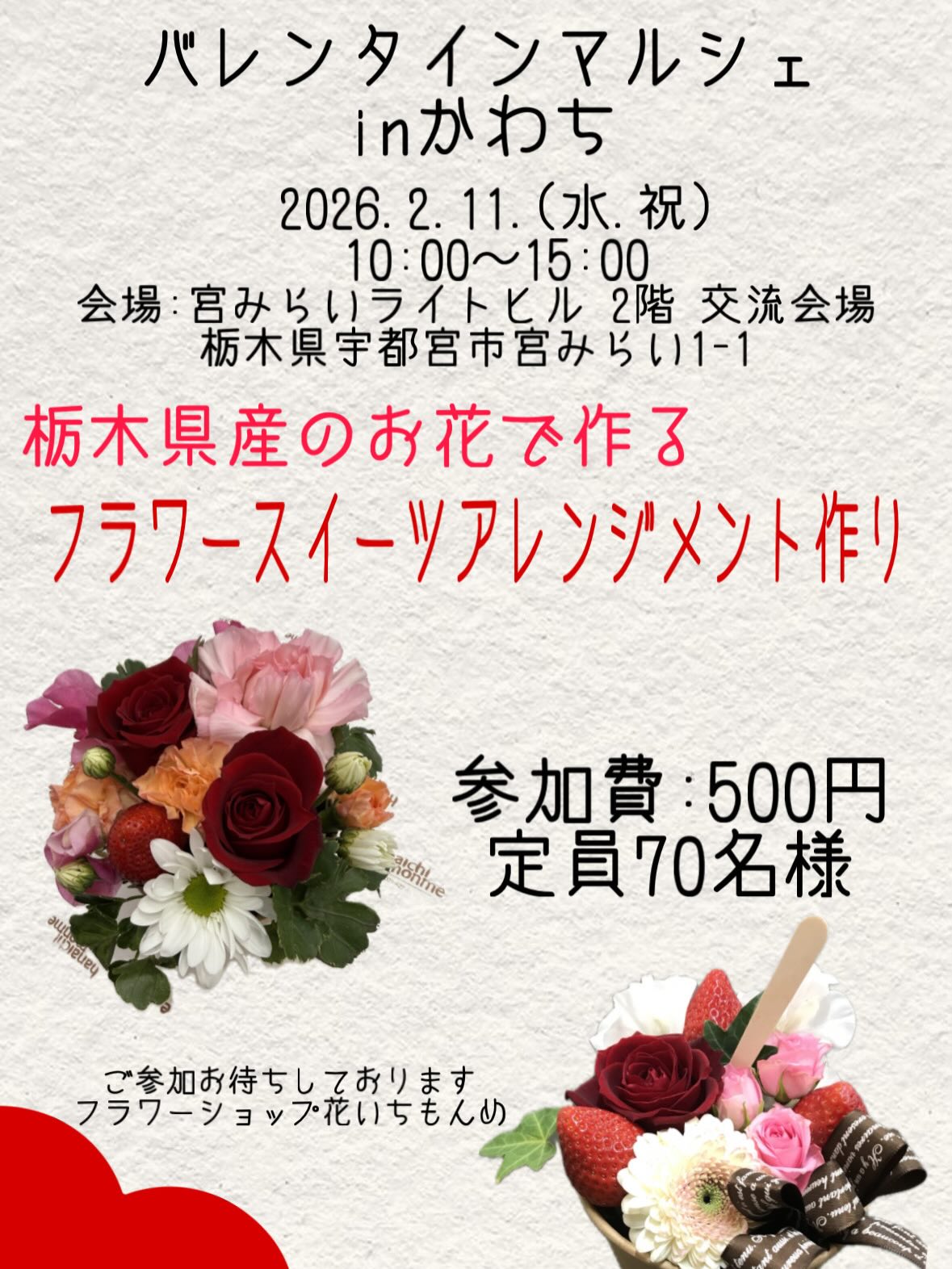 「バレンタインマルシェinかわち」にて、栃木県産のお花で作るフラワースイーツアレンジメント作りをお楽しみいただけます。